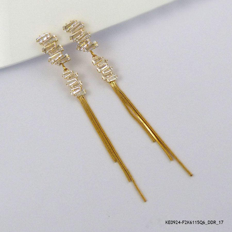 This pair of Earring is 14K Gold Plated with synthetic crystals. Its base metal is unknown. The length of earring is 9.2cm. These FASHION JEWELLERIES don’t come with WARRANTY but are good for DRESS WEAR purpose.